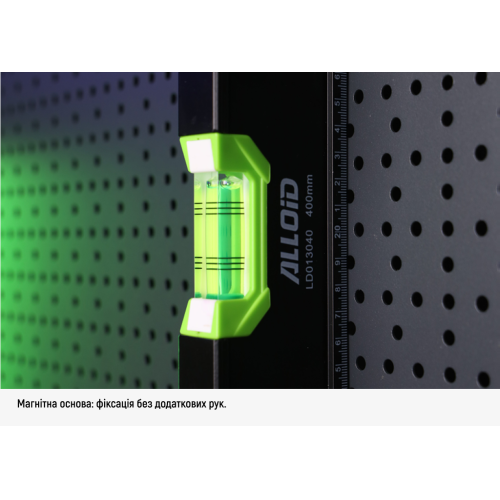 Рівень Alloid Pro довжиною 40 см — це професійний вимірювальний інструмент, який поєднує точність, зручність і надійність. Завдяки трьом капсулам (0°, 45°, 90°), він ідеально підходить для точних горизонтальних, вертикальних і кутових вимірів.