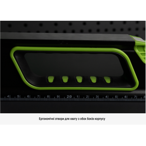 Корпус виготовлений з анодованого алюмінію, є вбудовані магніти, міліметрова шкала по всій довжині та 2 ергономічних вирізи для зручного хвату.