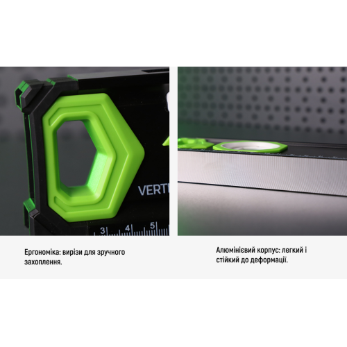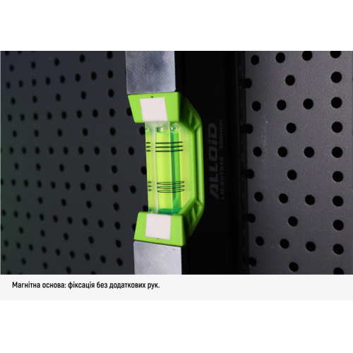 Рівень довжиною 800 мм використовується для вирівнювання профілів, каркасів, дверних і віконних блоків, меблів та плитки. Магнітна основа дозволяє фіксувати інструмент на металевих поверхнях без додаткових кріплень, що особливо зручно при роботі на висоті або в обмеженому просторі. Бокове віконце спрощує зчитування показників у вертикальному положенні.