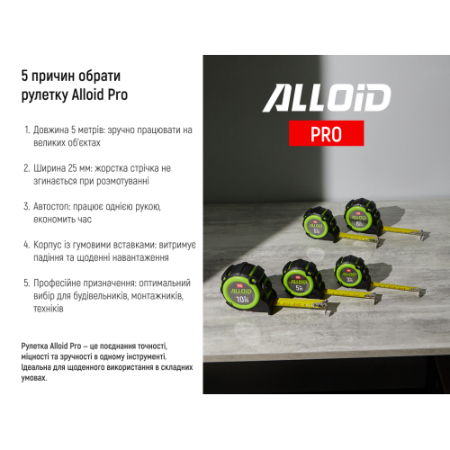 Рулетка Alloid Pro MT-740525 — професійний інструмент з довжиною стрічки 5 метрів і шириною 25 мм, створений для точних замірів на великих об'єктах.