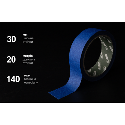 Ширина 30 мм і товщина 140 мкм дозволяють якісно закривати краї при фарбуванні, навіть у кілька шарів. Стійка до УФ-випромінювання та температур до 60 °C, чудово тримається на різних поверхнях і не залишає слідів клею після видалення.