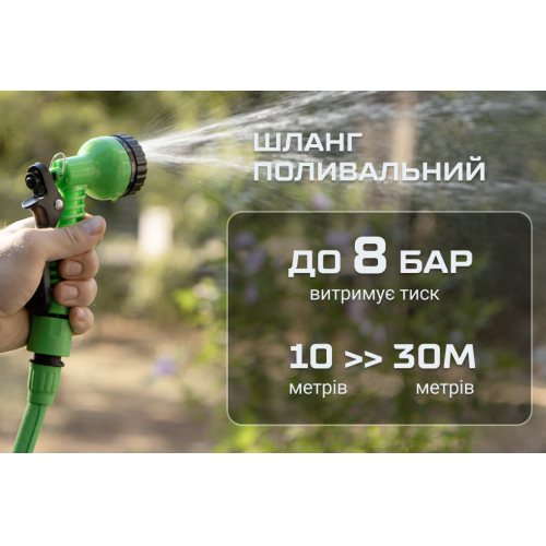 • Комплектація: шланг, пістолет-розпилювач (8 режимів), конектори