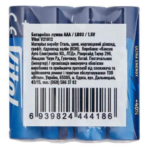 Блістерна упаковка з 4 батарейками Vitol AAA LR03.