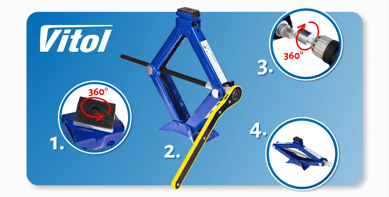 • Тріщатка: дозволяє підіймати автомобіль короткими зворотно-поступальними рухами важеля без необхідності робити повний оберт — суттєво знижує фізичне зусилля та прискорює процес.