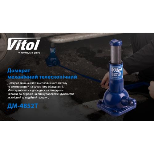 20 років на ринку України та десятки тисяч задоволених клієнтів підтверджують якість та надійність товарів ТМ Вітол. Придбавши телескопічний механічний домкрат ДМ-4852Т, ви будете готові до будь-яких викликів, які може кинути вам автомобільне життя.