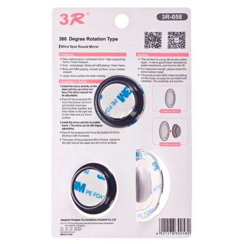 Зеркало “мертвая зона” 3R-058 предназначено для использования в легковых автомобилях и других транспортных средствах с боковыми зеркалами обзора. Зеркало имеет круглую форму с сферически выгнутым отражателем. Несмотря на малый размер, всего 52 мм, благодаря своей форме зеркало отражает значительно больший участок, чем штатные зеркала, и помогает избежать эффекта “мертвая зона