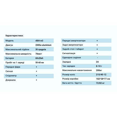 Електроскутер оснащений двигуном потужністю 2000 Вт, який забезпечує динамічний розгін і стабільну їзду в міських умовах. Акумулятор 60V 20Ah дозволяє долати значні відстані без частих підзарядок, що робить модель практичною для щоденного використання.