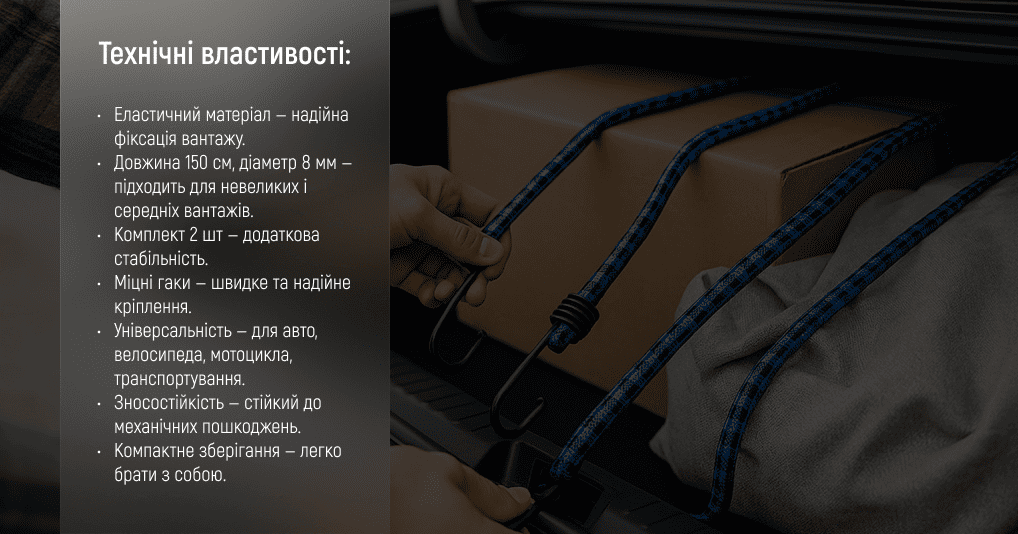 Еластичний фіксатор вантажу – це універсальний аксесуар, який забезпечує надійну фіксацію багажу при транспортуванні. Ідеально підходить для використання в автомобілі, на мотоциклі, велосипеді, а також у побуті та туристичних поїздках.