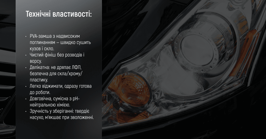 Завдяки своїм вологопоглинаючі властивостями дана серветка відмінно підійде для просушування кузова авто та інших поверхонь після миття.