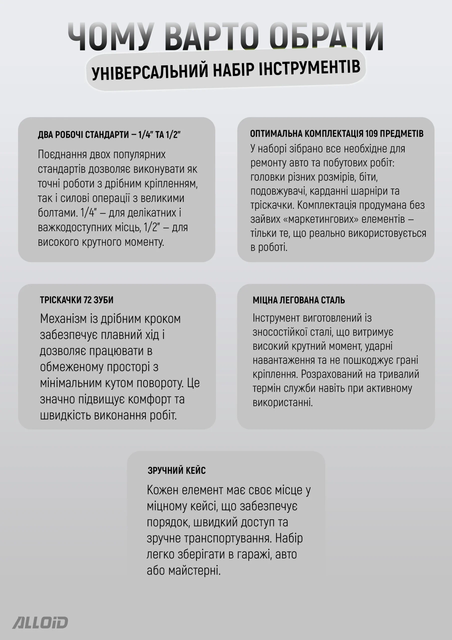 - Тріскачки: 2 шт. (1/4″ та 1/2″), 72 зубці, протиковзні рукоятки