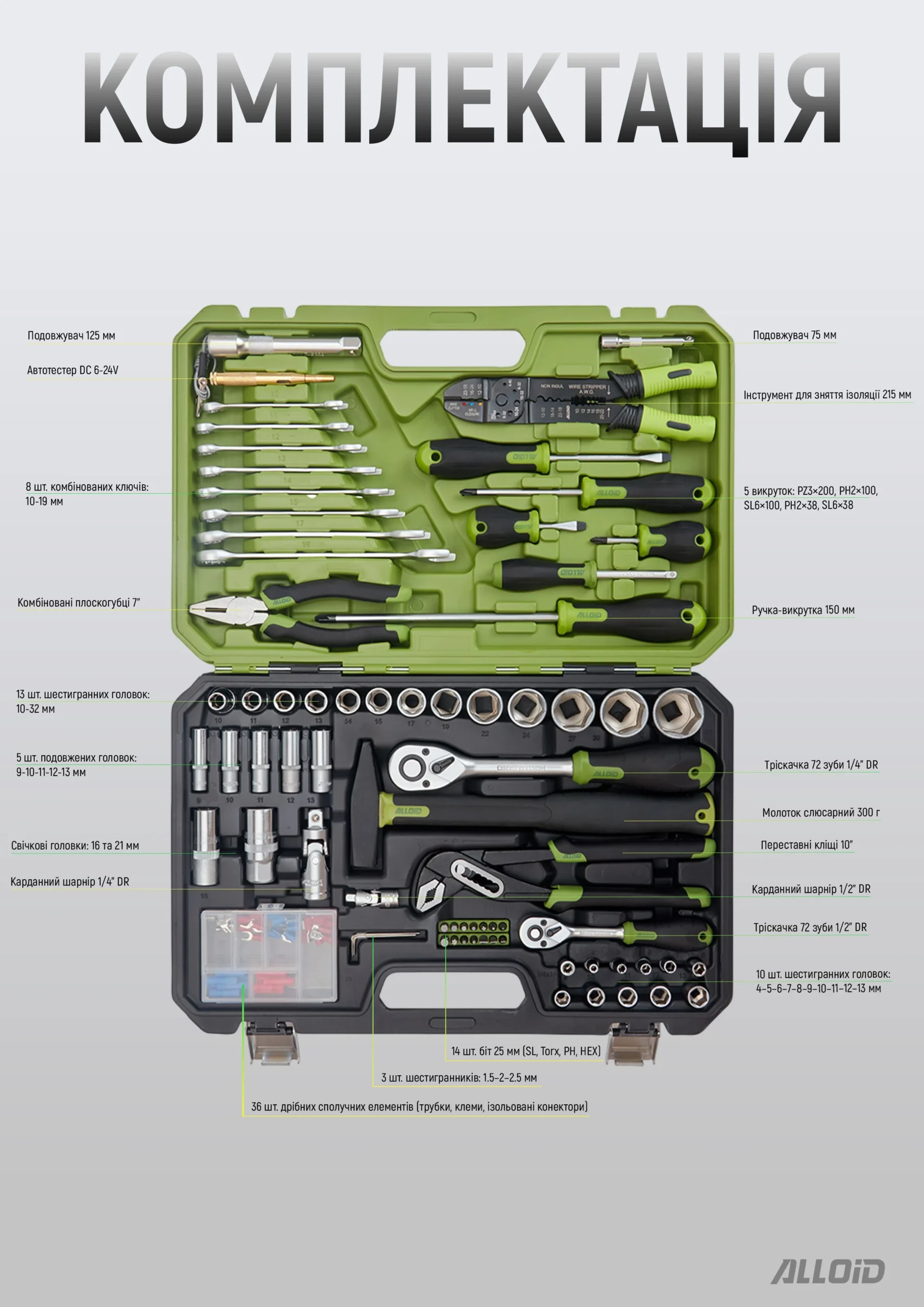 Набір інструментів Alloid NI-109P — це комплексне рішення для автолюбителів, майстрів СТО та домашніх майстерень, яке поєднує два стандарти приводу: 1/4″ та 1/2″ DR. Усього 109 предметів у складі охоплюють весь спектр задач: від демонтажу ходової частини до роботи з електропроводкою. Відмінна риса набору — наявність електротехнічного інструменту та автотестера, що перетворює його на справжній «комплект першої необхідності» для обслуговування бортової мережі автомобіля.