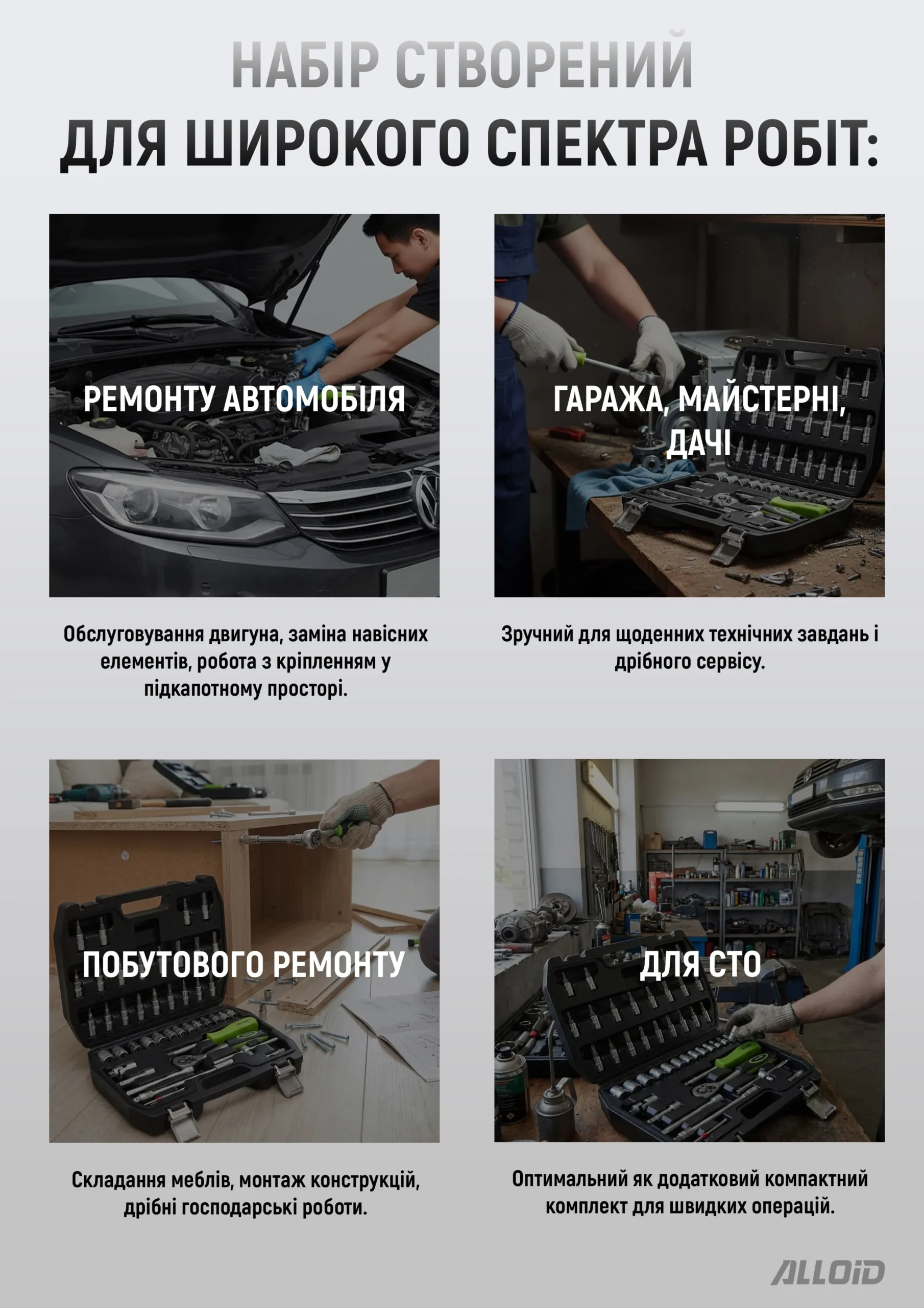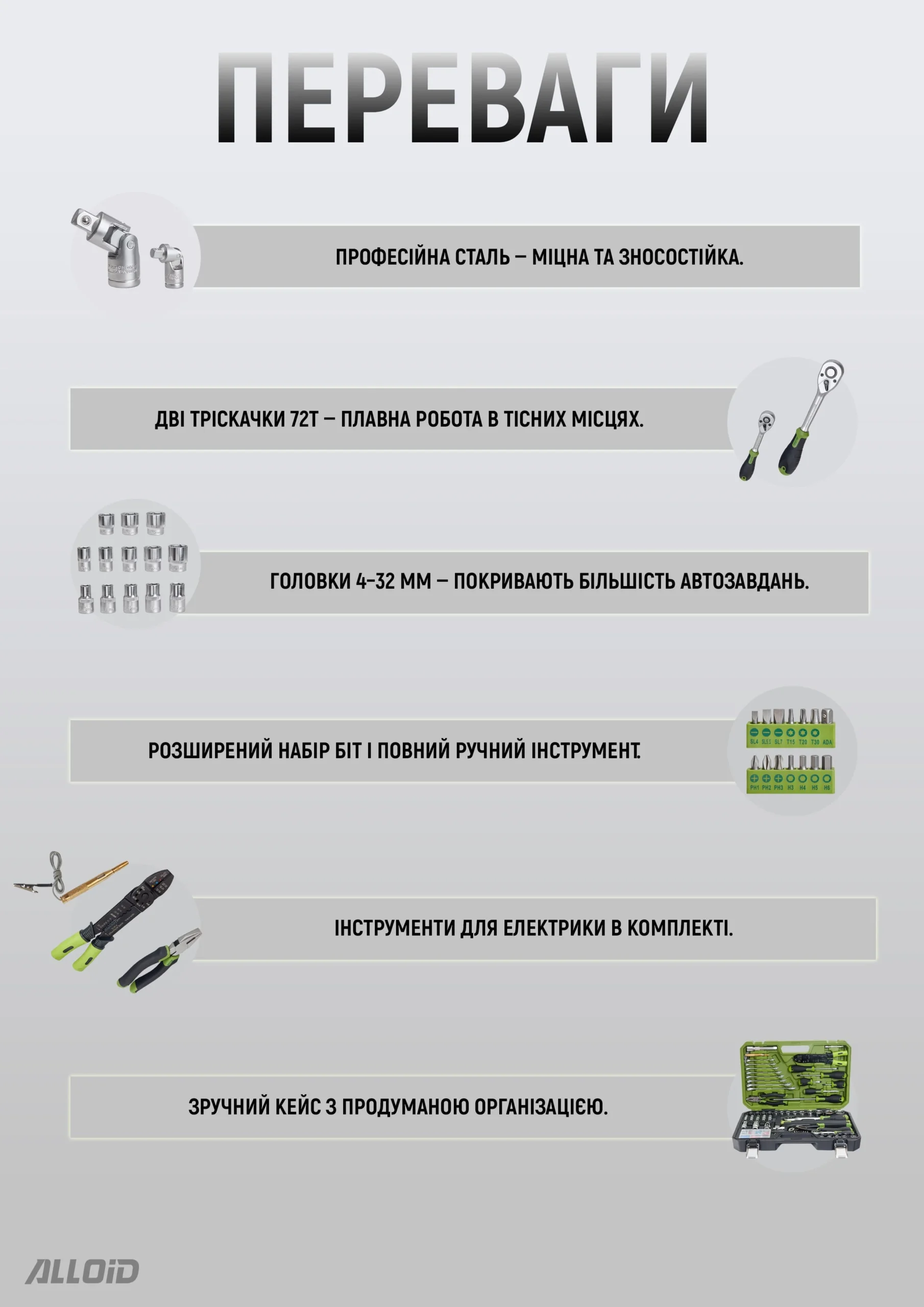 Набір Alloid NI-109P призначений для автомобільного ремонту, монтажних та слюсарних робіт, а також для обслуговування домашнього обладнання. Два типи приводу — 1/4″ для точних операцій з дрібними кріпленнями та 1/2″ для силових задач — дають змогу ефективно працювати без перехідників. Завдяки автотестеру на 6–24 В та інструменту для зачистки проводів набір стає у пригоді при діагностиці та ремонті електричних ланцюгів авто. Компактний кейс із надійними засувками робить комплект зручним для роботи як у гаражі, так і у виїзних умовах.