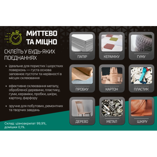 Клей ефективно з'єднує паперові та картонні вироби, забезпечує якісне виконання офісних і творчих завдань, створення декоративних виробів, прикрас та предметів ручної роботи (Handmade). Також підходить для відновлення побутових речей і дрібних ремонтних робіт.