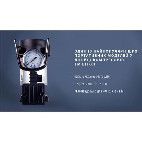 Модель укомплектована повітряним шлангом з набором адаптерів, перехідником для підключення до АКБ автомобіля, манометром для контролю тиску і зручною сумкою для зберігання і перенесення компресора.