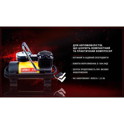 Автомобільний компресор VOIN VL-585 швидко накачає колесо вашого авто до необхідного тиску. Правильний тиск шин продовжує термін їх служби, зменшує витрату пального та покращує комфорт їзди.