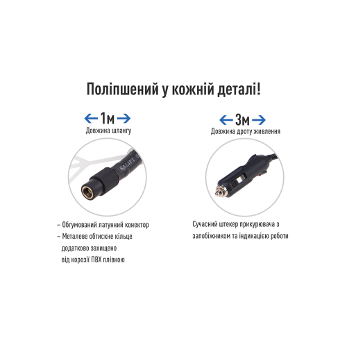 Оснащений 1-метровим повітряним шлангом і 3-метровим кабелем живлення, компресор забезпечує зручний доступ до всіх коліс автомобіля.