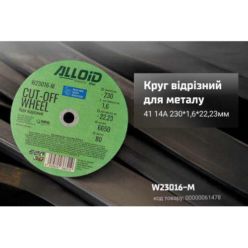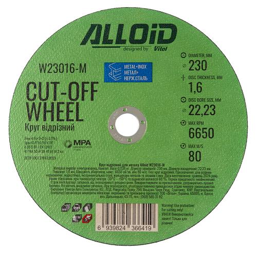 Відрізний круг Alloid W23016-M діаметром 230 мм і товщиною 1,6 мм призначений для чистого та глибокого різання чорного металу та нержавіючої сталі.