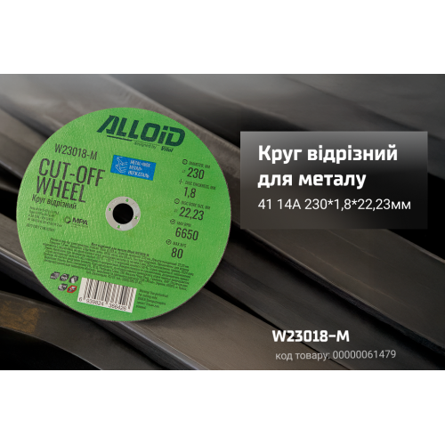 Відрізний круг Alloid W23018-M діаметром 230 мм і товщиною 1,8 мм призначений для роботи з чорними металами та нержавіючою сталлю.