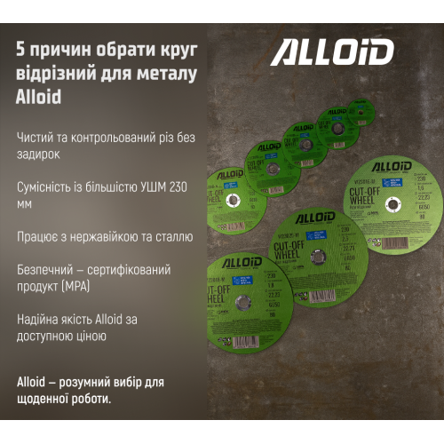 Відрізний круг Alloid 41 14А, Ø230×1,8×22,23 мм — плоский (тип 41) абразивний диск з електрокорунду (14А), розроблений для точного й стабільного різання металу та сталі з оптимальним балансом швидкості та міцності: