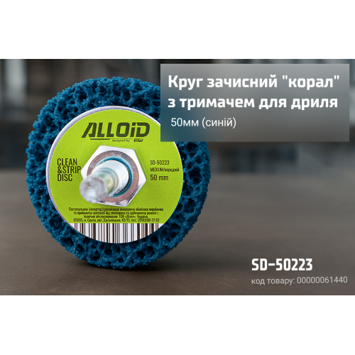 Зачисний круг “Коралл” Alloid SD-50223 (Ø50 мм, синій, середня жорсткість) — універсальний інструмент для ефективного очищення металу, деревини та інших матеріалів.