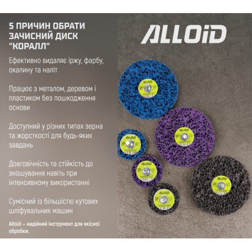 Круг зачисний “корал” Alloid 50 мм з тримачем для дриля — професійний інструмент для ефективного очищення та підготовки поверхонь.