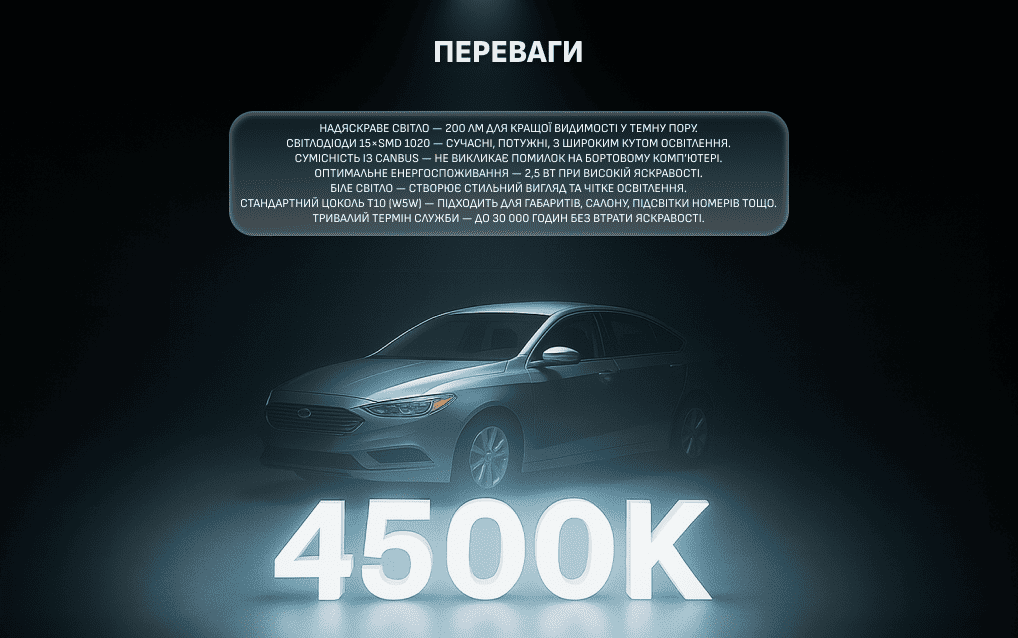 - Режим роботи: габарит-повторювач поворотів-підсвічування номерного знака