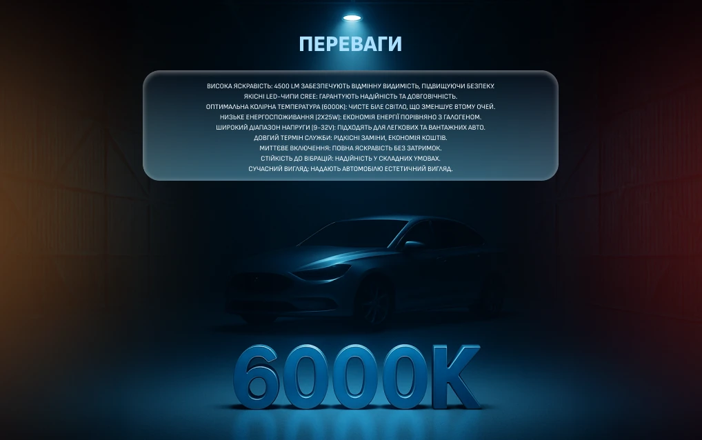 Чіп CREE відомий стабільною яскравістю і тривалим ресурсом — він зберігає світловий потік на рівні 4500 Лм протягом усього терміну служби, не втрачаючи яскравості з часом, як це трапляється з галогенними аналогами. Колірна температура 6000 K формує чіткий холодний білий промінь, максимально наближений до денного світла, що зменшує втому очей під час тривалого нічного водіння. Пасивне охолодження без вентилятора забезпечує безшумну роботу та виключає зношування рухомих частин. Внутрішній драйвер спрощує монтаж — не потрібні зовнішні блоки живлення чи перехідники.