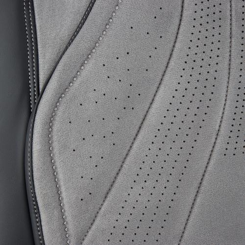 Поєднання екошкіри та текстильних вставок створює баланс між практичністю та комфортом. Екошкіра захищає сидіння від забруднень і легко очищується, а текстильні елементи з перфорацією сприяють циркуляції повітря, що робить використання більш комфортним у різні пори року.