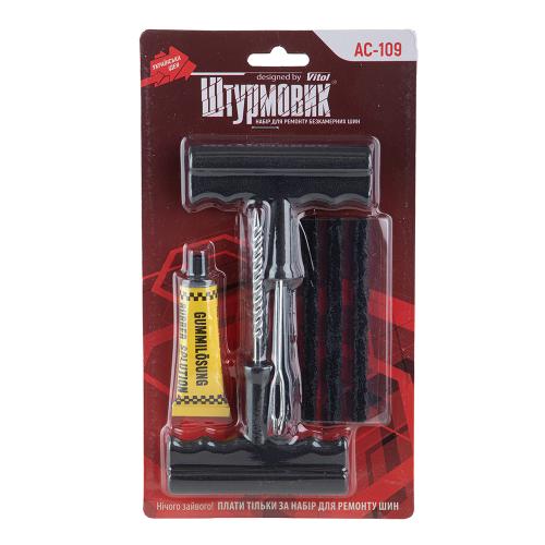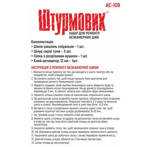 Набір для ремонту безкамерних шин “Штурмовик” АС-109 дасть вам змогу швидко й ефективно виправити проколи коліс у ділянці протектора.