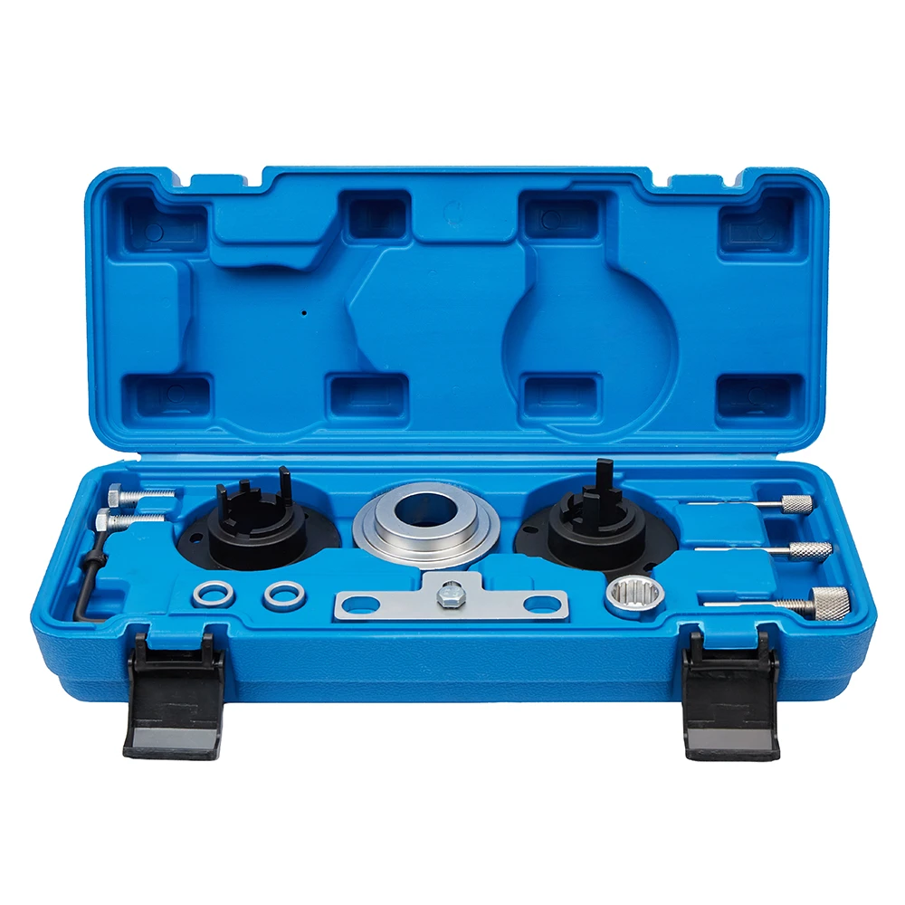 Двигун Ford 1.0L EcoBoost відрізняється компактною конструкцією з ременем ГРМ, що потребує точного суміщення міток одразу кількох валів. Фіксатори розподільних валів встановлюються безпосередньо на зірочки VVT і жорстко утримують їх у потрібному положенні. Стопорні штифти колінчастого вала блокують його від провертання під час затягування або послаблення гайки шківа. Регулювальні пристосування для натягувача дозволяють коректно виставити натяг ременя відповідно до заводських вимог.