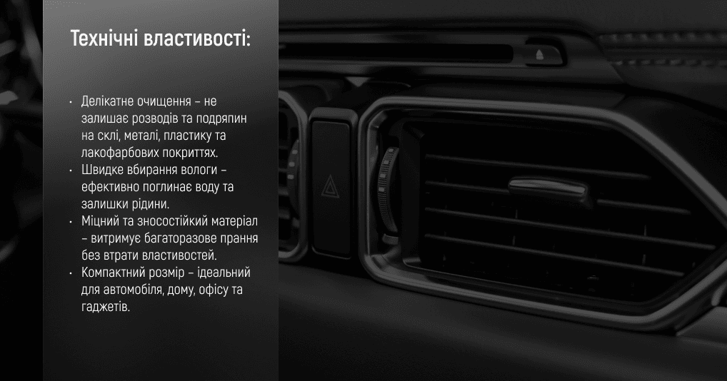 - Салон (пластик, глянець, екрани): розпилюйте на ганчірку, не на поверхню; легкі прямі рухи.