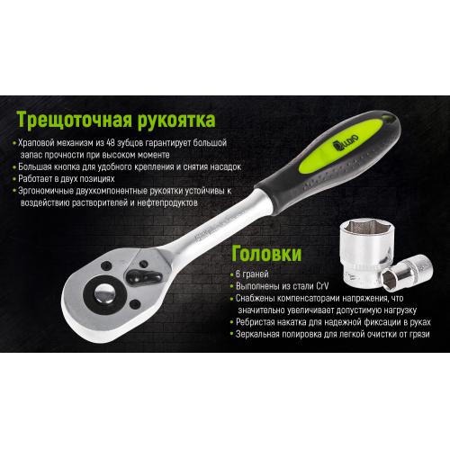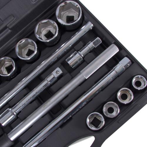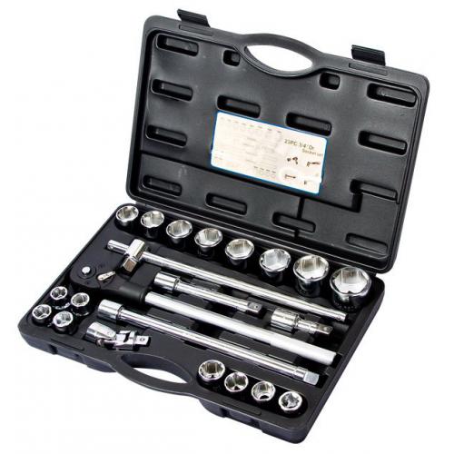 У наборі міститься 23 одиниць інструментів, які дозволяють виконувати більшість завдань в автомайстерні. У комплекті є все необхідне для ремонту — тріскачка на квадрат 3/4” та великій вибір головок різних розмірів.