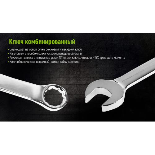 Комбінований ключ має ріжкову та накидну частину, що значно підвищує його функціональність, а дванадцятигранний профіль накидних головок забезпечує роботу як з 6, так і з 12-гранними кріпильними елементами.