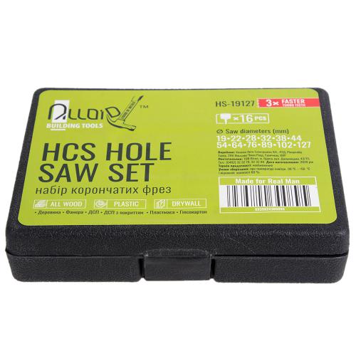 Набір корончастих фрез по дереву 16 предметів (19, 22, 28, 32, 38, 44, 54, 64, 76, 89, 102, 127 мм) Alloid