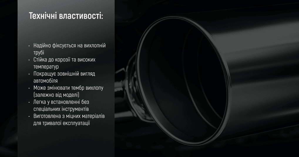 Насадка на глушник несе в собі дві властивості, перше це захист вихлопної труби від корозії, практично повністю, виключаючи контакт вихлопної труби з зовнішньо середовищем, друга властивість – це поліпшення естетичного вигляду автомобіля.