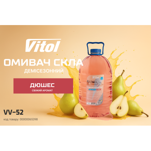 Всесезонний омивач скла VITOL «–5°» з ароматом дюшесу ефективно видаляє бруд, сліди комах і сольові розводи. Забезпечує ідеальну видимість у будь-яку пору року та наповнює салон приємним грушевим ароматом.