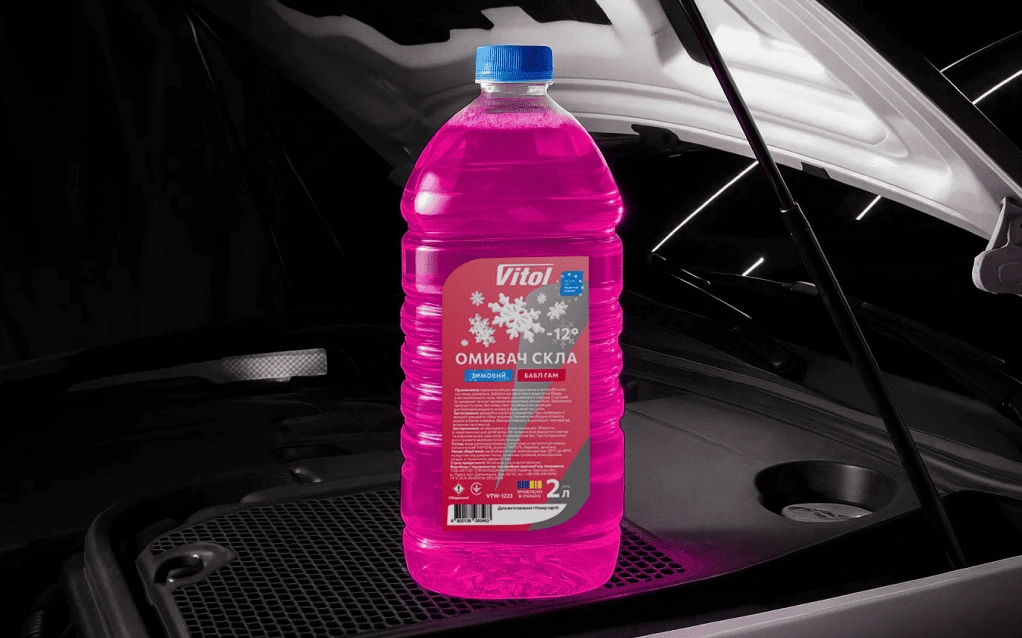 Зимовий омивач скла VITOL -12°C Бабл Гам — готова до використання рідина для очищення лобового та заднього скла, фар і дзеркал у холодний сезон. Формула розрахована на роботу при низьких температурах до -12°C та допомагає швидко прибирати дорожній бруд, реагенти, сольові нашарування і зимову сльоту без розводів, щоб огляд залишався чітким у місті й на трасі.