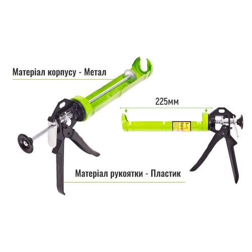 За допомогою даного пістолета можна точно і рівномірно нанести герметик та клей. Конструкція металевого корпусу пістолета дозволяє рівномірно розподіляти навантаження, що позитивно позначається як на плавності процесу видавлювання робочої суміші, так і на довговічності інструменту.