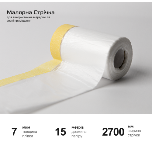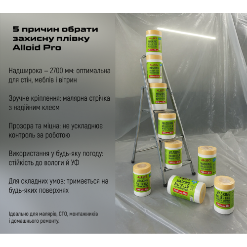 Найширша захисна плівка Alloid Pro — 2700 мм — це максимальне укриття для професійного ремонту. Прозора поліетиленова основа з вбудованою малярною стрічкою дає змогу легко фіксувати плівку навіть на висоті. Ідеальна для закриття стін, меблів, фасадів або авто під час фарбування.