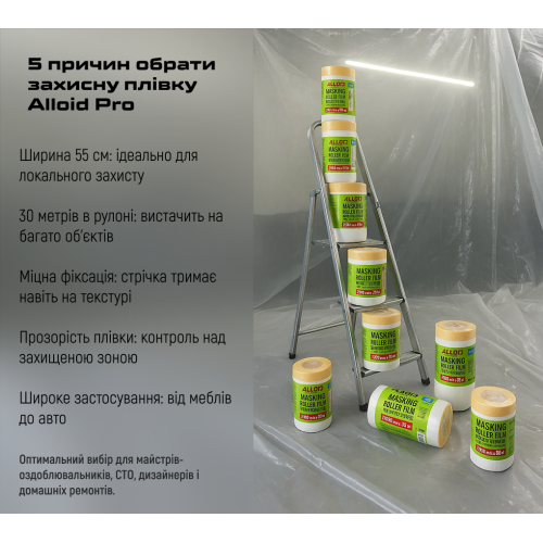 Компактна захисна плівка з малярною стрічкою Alloid Pro — універсальне рішення для точкових оздоблювальних і фарбувальних робіт. Ідеально підходить для закриття плінтусів, підвіконь, техніки, елементів інтер’єру. Надійно фіксується на будь-яких поверхнях завдяки комбінованій структурі плівки та стрічки.