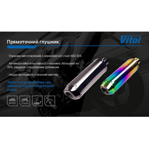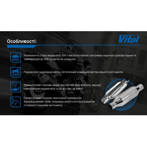 Прямоточний глушник від торгової марки Vitol виконаний з нержавіючої сталі і прекрасно протистоїть корозії навіть при попаданні на нього антігололедних реагентів, що використовуються в зимову пору року.