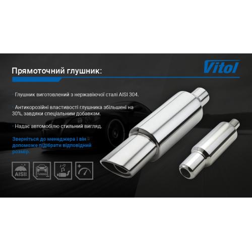 Прямоточний глушник від торгової марки Vitol виконаний з нержавіючої сталі і прекрасно протистоїть корозії навіть при попаданні на нього антігололедних реагентів використовуваних в зимову пору року.