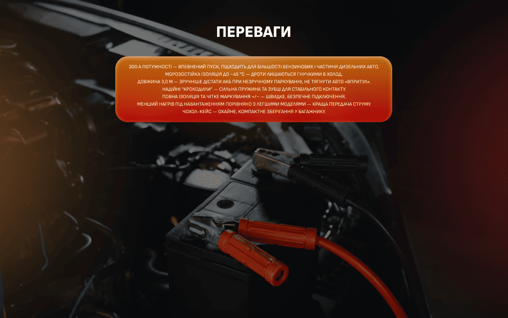 Тримайте дроти подалі від гарячих/рухомих частин; не використовуйте пошкоджені АКБ/кабелі; не змішуйте 12 В і 24 В; гібриди/EV «прикурювати» лише за інструкцією виробника.