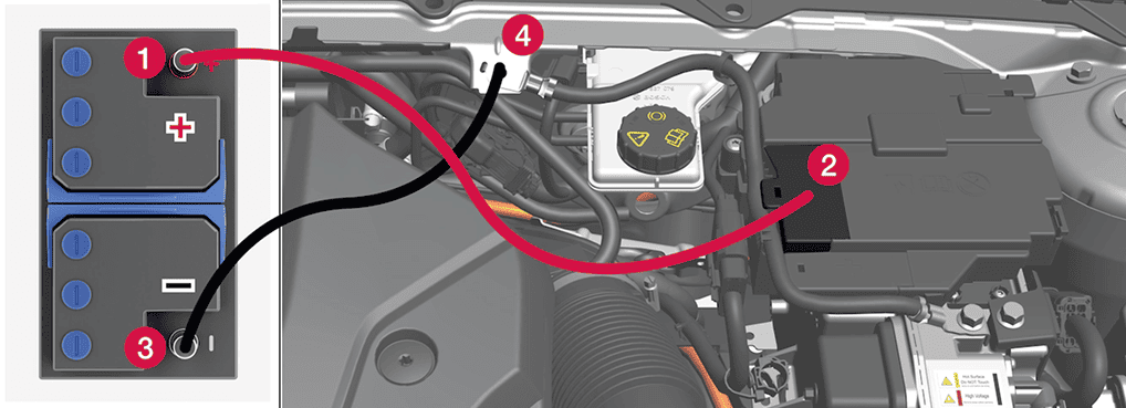 2 — Інший кінець червоного до плюсової клеми/штатної точки під кришкою автомобіля з розрядженим АКБ.