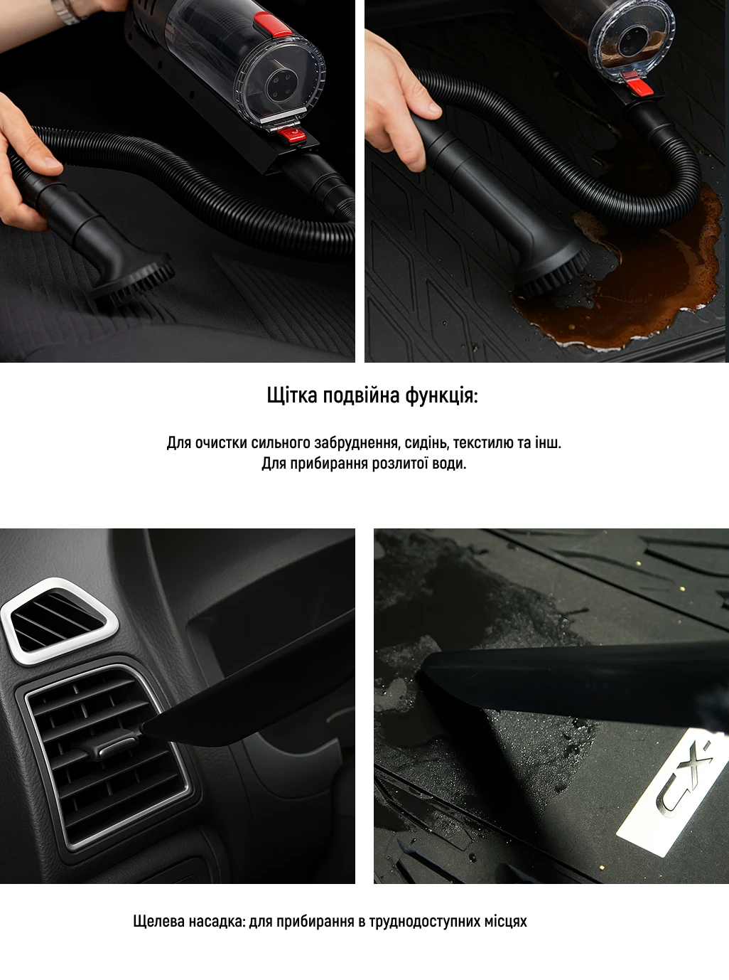 - Щітка з подвійною функцією — очищення сидінь і підлоги у стандартному режимі та збирання пролитих рідин при вологому прибиранні