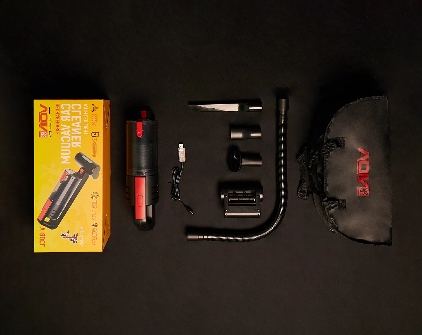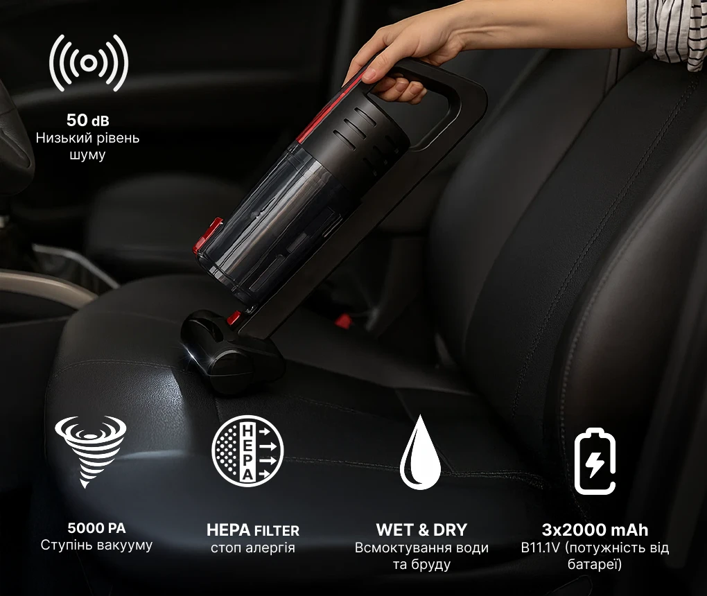 Пилосос VOIN V-80CL — бездротовий автомобільний пилосос для сухого й вологого прибирання з потужністю 100 Вт та акумуляторним живленням від трьох елементів ємністю по 2000 мАг. Завдяки компактному корпусу вагою 1,7 кг і вбудованому LED-ліхтарю він однаково ефективний як у щоденному прибиранні салону, так і в роботі в умовах недостатнього освітлення. Пристрій не потребує підключення до мережі, що забезпечує повну свободу пересування під час роботи.