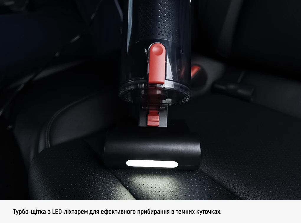 - Турбощітка з LED-підсвіткою — глибоке чищення килимового покриття і тканинної оббивки; підсвітка допомагає не пропустити забруднення в затінених зонах