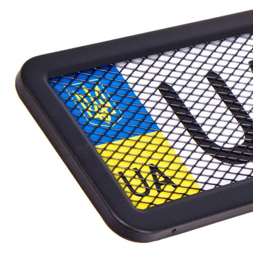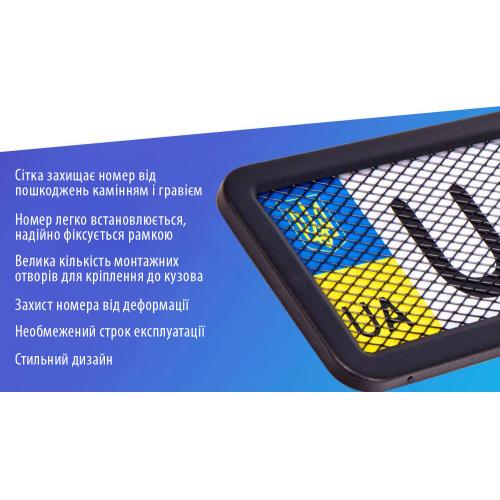 РНС-75055 виконана з корозійно-стійкої нержавіючої сталі з додатковим матово-чорним покриттям. Номерний знак надійно закріплюється всередині рамки завдяки спеціальним затискачів. Дрібна сітка всередині рамки з аналогічним чорним покриттям захищає державний номерний знак від пошкодження камінням, щебенем або гравієм.