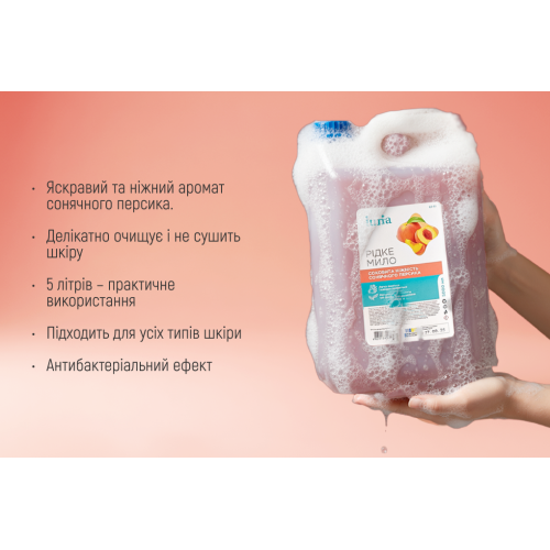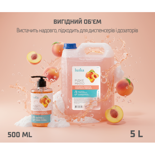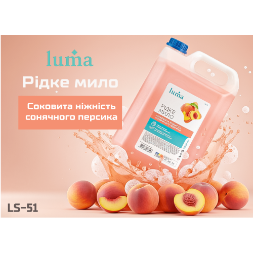 Рідке мило Luma «Персик» 5 л (LS-51) — практичне рішення для дому та професійного використання. Забезпечує делікатне очищення шкіри й наповнює простір приємним фруктовим ароматом.