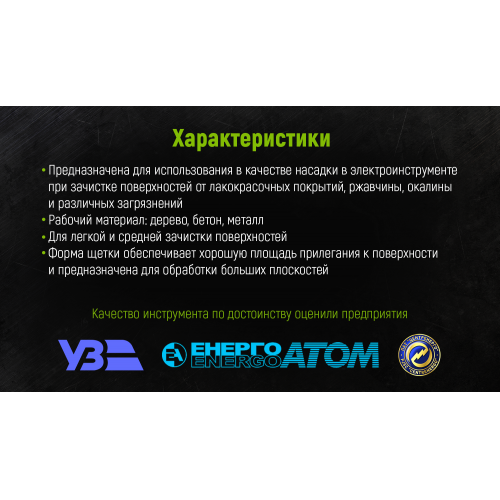 Щітку можна використовувати в якості насадки для болгарки для очищення від іржі, а також видалення фарби. Завдяки своїй формі щітка забезпечує відмінну площу прилягання до поверхні.